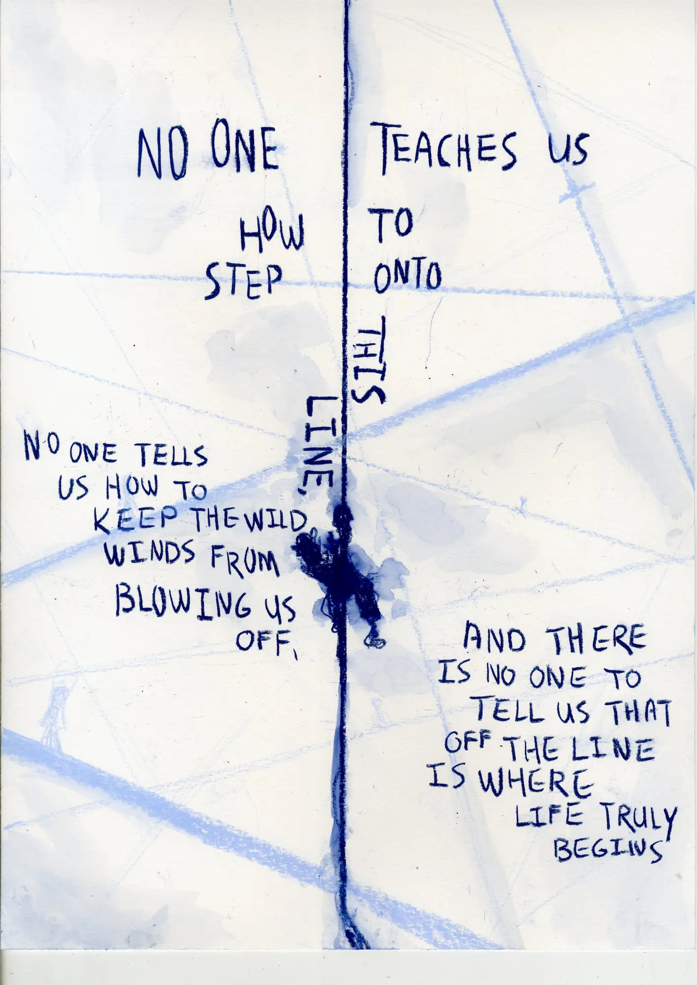 I am twenty years old when I reach down and attempt a comforting hand on their shoulder. At twenty years old they would expect me to have all the answers ready, for me to serve them as a guide which they have lacked. For no one teaches us how to step onto this line, no one tells us how to keep the wild winds from blowing us off, and there is no one to tell us that off the line is where life truly begins.