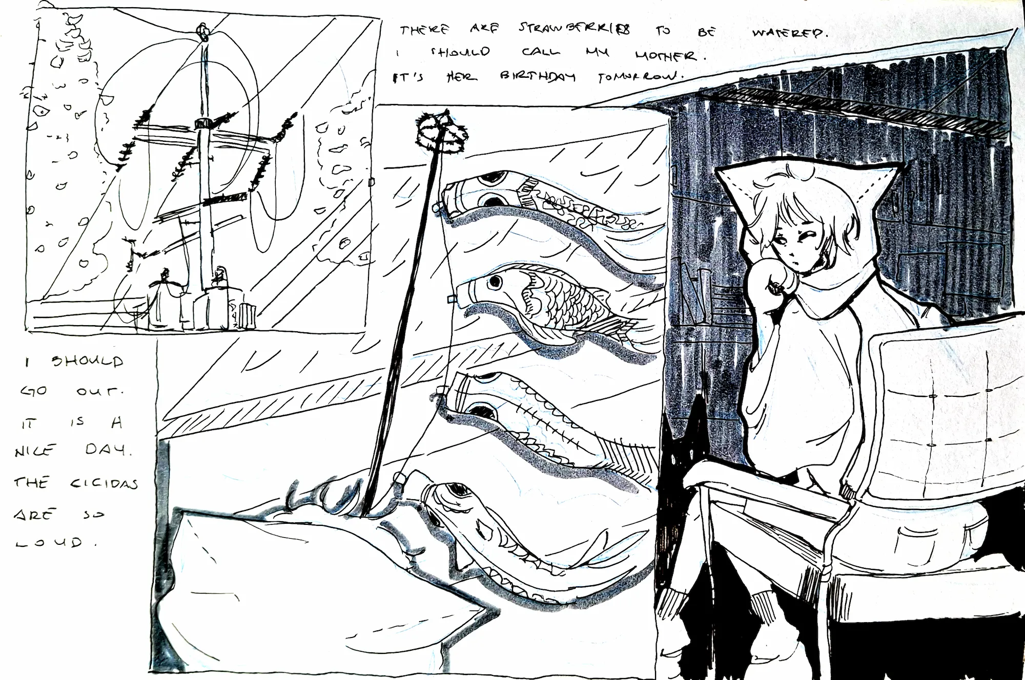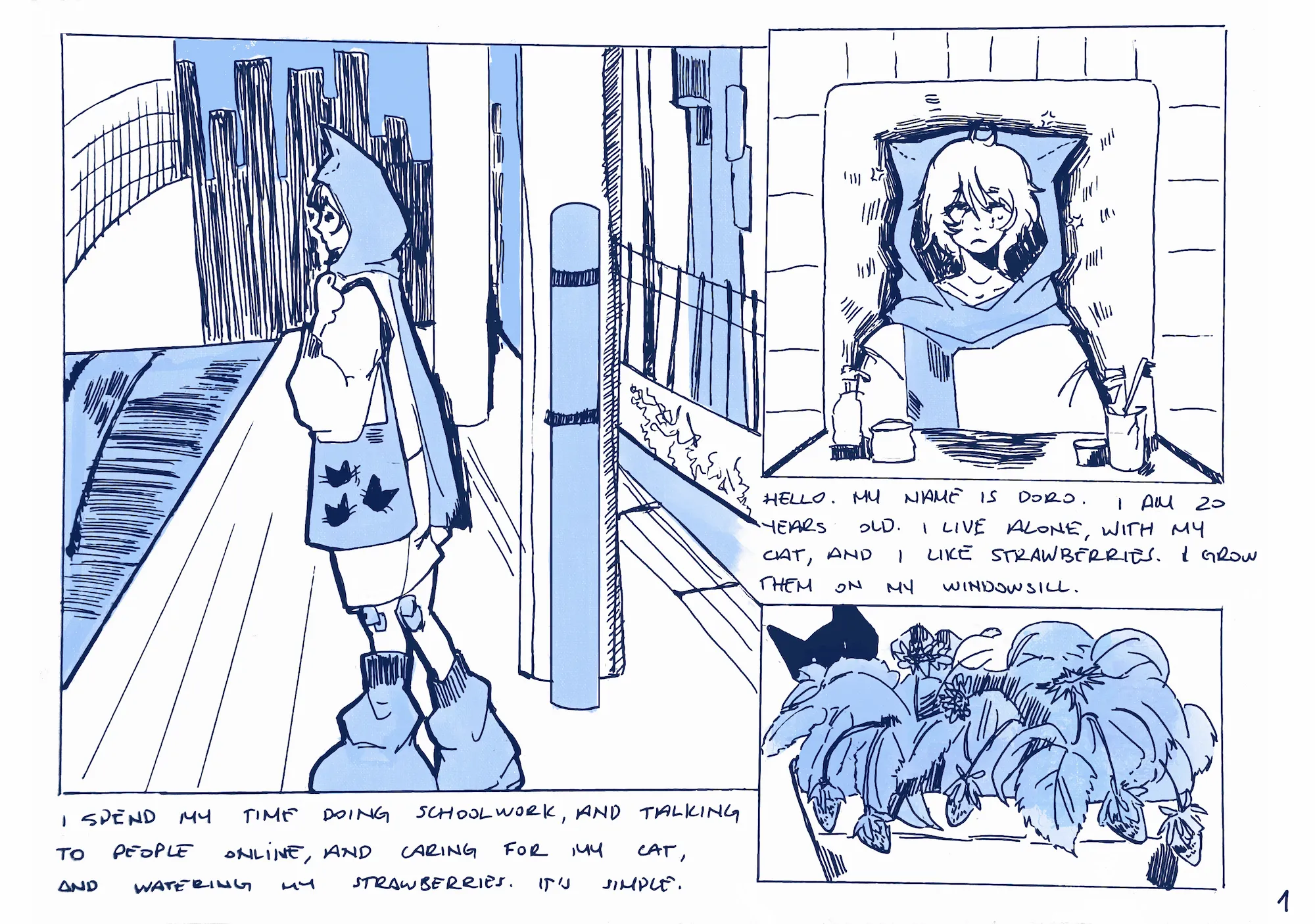 This is a comic based on my experiences I had when I first moved to a new country, and about how I tried to resolve issues I encountered in my own way. I use a variety of techniques here. The cover is linocut, the pages were made traditionally with alcohol marker and gel pens, scanned, edited, and reprinted in risography. For the animation, I used a similar multimedia approach. Using this many techniques was not my original intention, however I think it adds to the feelings of nostalgia and estrangement I wanted to incorporate into the comic. The different printing techniques are akin to that of different feelings for me, while having their origin in the same place, the human person experiencing life.